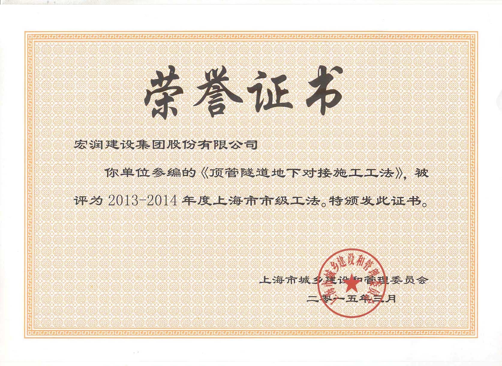 獲得2013-2014年度上海市市級工法證書-頂管隧道地下對接施工工法