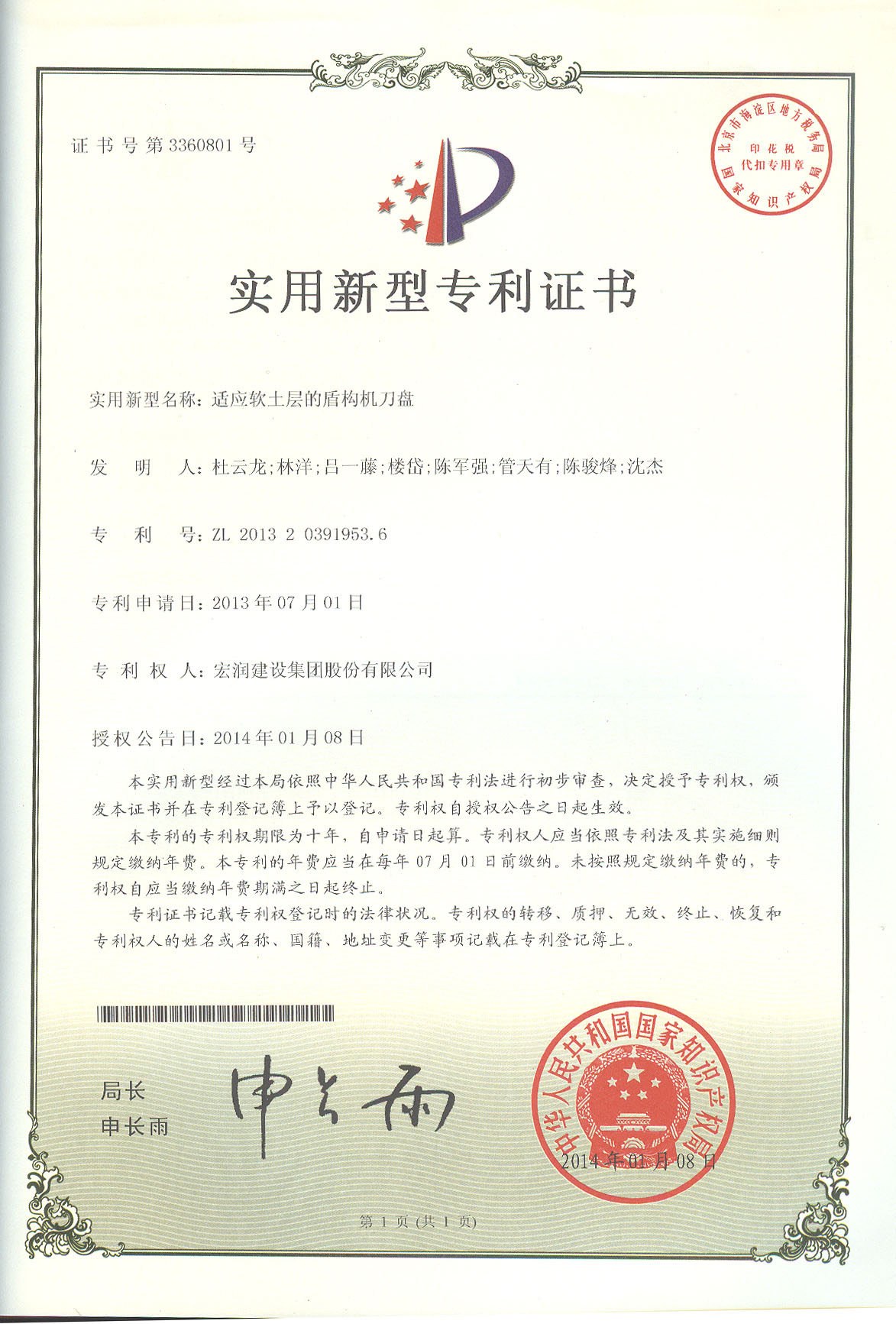 實用新型專利證書-適應(yīng)軟土層的盾構(gòu)機刀盤