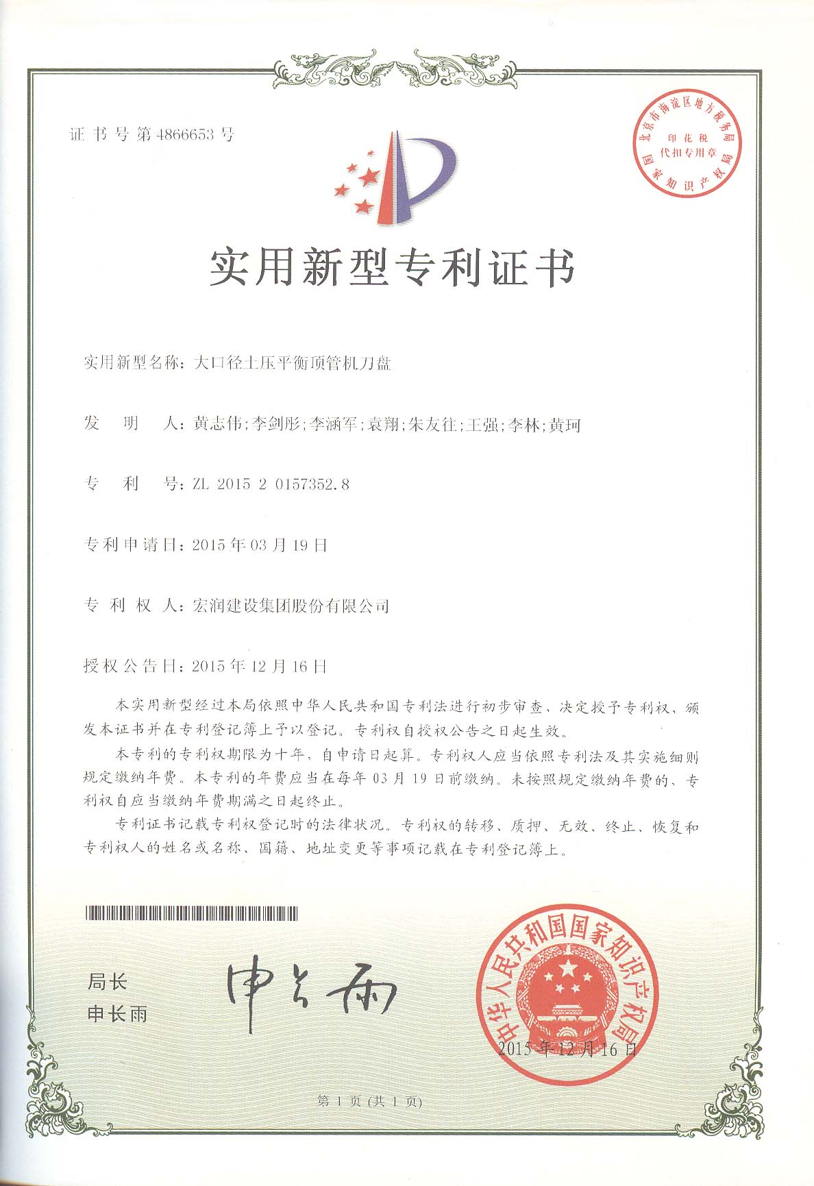 實(shí)用新型專利證書-大口徑土壓平衡頂管機(jī)刀盤