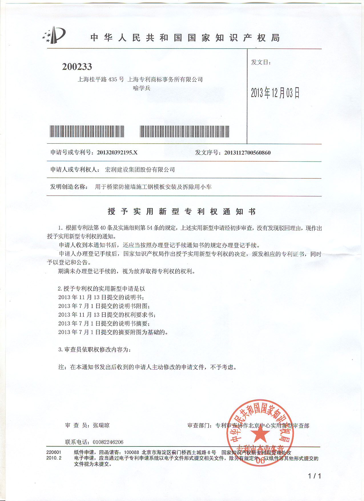 授予實(shí)用新型專利權(quán)通知書-用于橋梁防撞墻施工鋼模板安裝及拆除用小車